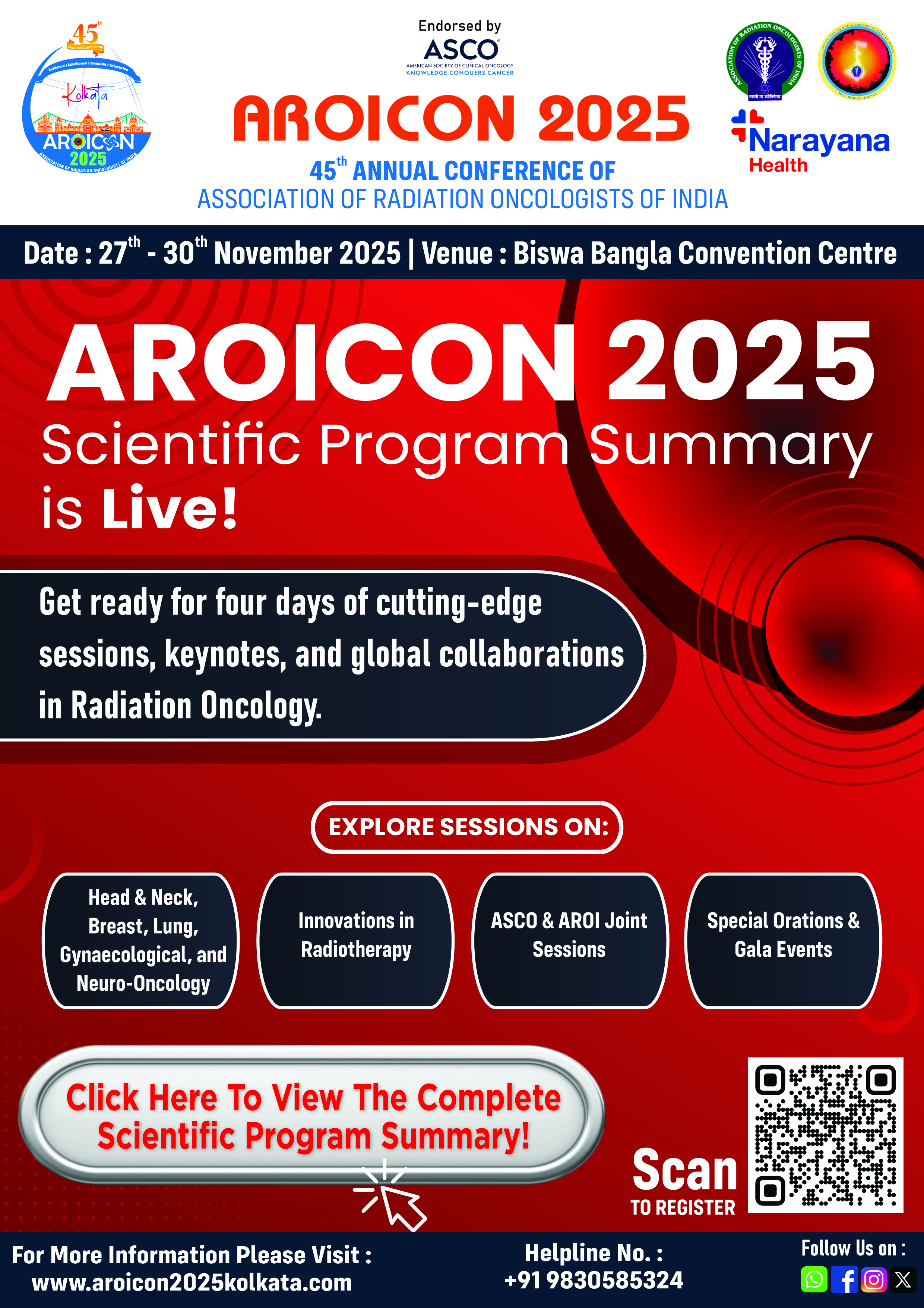We are excited to extend a warm invitation to the 45th Annual Conference of the Association of Radiation Oncologists of India - AROICON 2025, hosted by the AROI West Bengal Chapter, set to take place from November 27th to 30th, 2025, at the stunning Biswa Bangla Convention Centre, Kolkata. We are embarking on a journey of knowledge, collaboration, and discovery, as we gather in one of India’s most dynamic and culturally vibrant cities. AROICON 2025 promises to be a transformative event, bringing together practitioners and researchers from across the globe to engage in thought-provoking discussions and explore the latest innovations in radiation oncology.
